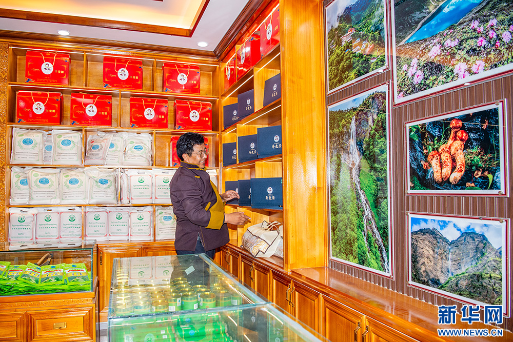 10月11日拍摄的西藏山南市洛扎县谢翁温泉酒店柜台内展示的洛扎县农牧产品。新华网 旦增努布 摄