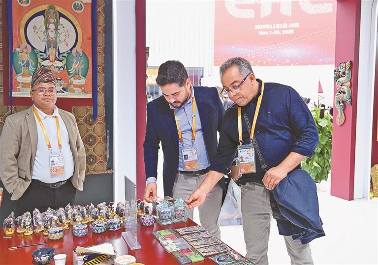 图为第八届中国国际进口博览会西藏馆内的客人在选购商品。记者 王敏 索朗琼珠 嘎松卓玛 摄影报道