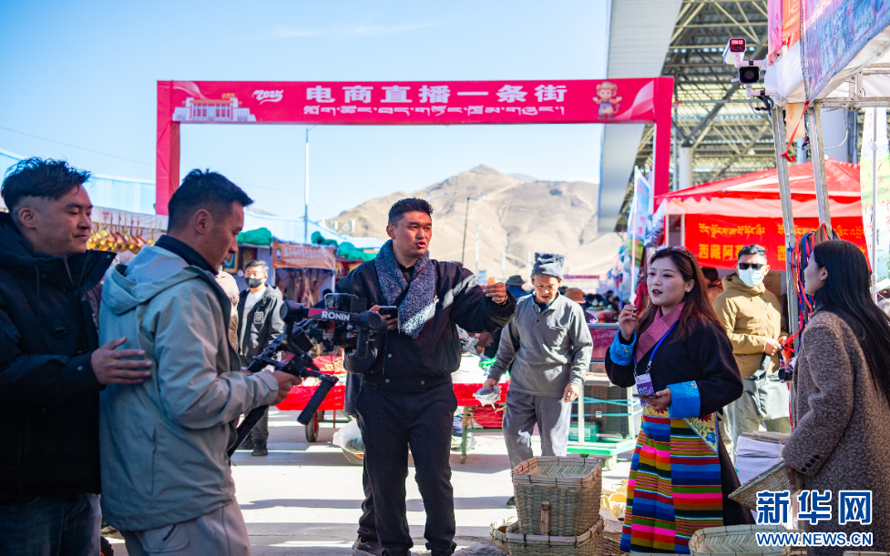 12月1日,一位电商主播在西藏自治区山南市第45届雅砻物资交流会现场介绍产品。新华网 旦增努布 摄