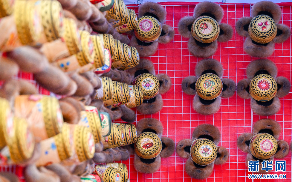 图为西藏自治区山南市第45届雅砻物资交流会上展示的金丝藏帽(12月1日摄)。新华网 旦增努布 摄