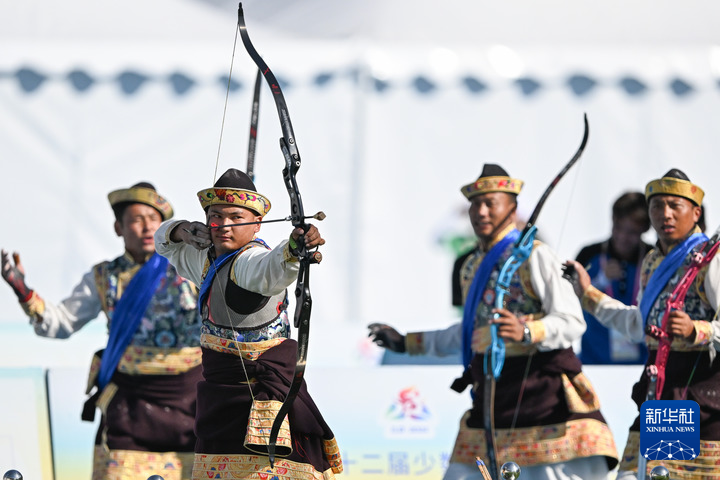 2024年11月27日,第十二届全国少数民族传统体育运动会表演项目中,西藏队选手表演《响箭》。新华社记者 孙凡越 摄