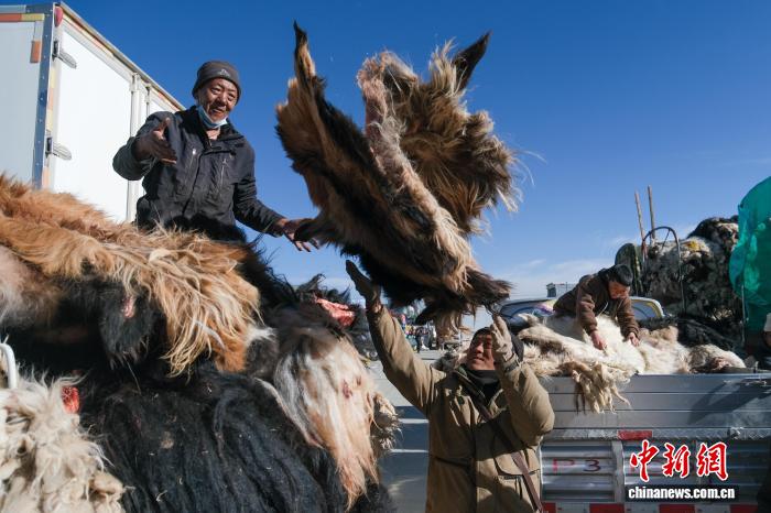 12月15日,西藏自治区那曲市第十八届畜产品展销会上,牧民在整理待售的羊皮。中新社记者 江飞波 摄