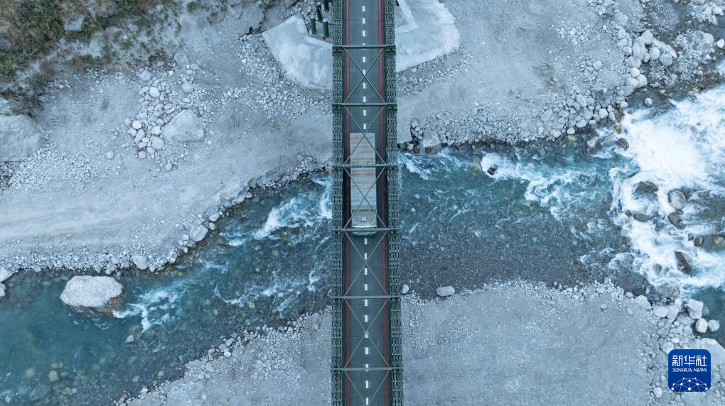 2026年1月1日,一辆尼泊尔货柜车经热索临时便桥驶向中国吉隆口岸(无人机照片)。新华社记者 丁增尼达 摄