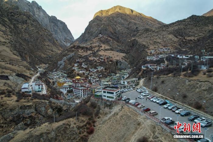 1月2日傍晚,拉萨市墨竹工卡县德仲温泉附近的停车场几乎停满了车辆。(无人机画面)中新社记者 江飞波 摄