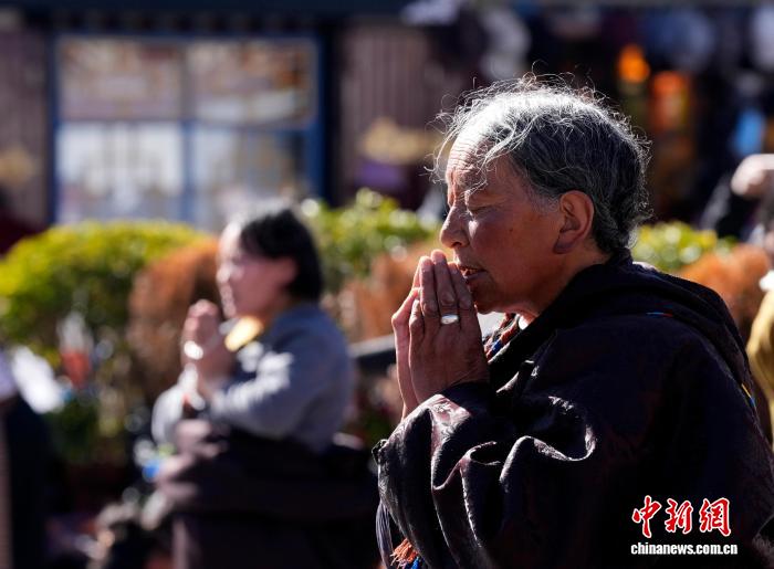 1月23日,西藏拉萨八廓街,信众手持转经筒转经。冬季高原进入农闲期,众多藏传佛教信众从各地来到拉萨,沿布达拉宫、大昭寺等地转经、朝拜、祈福。中新社记者 李林 摄