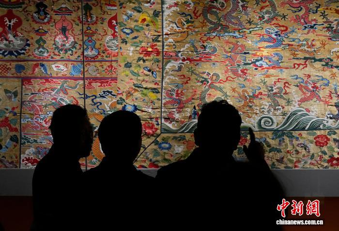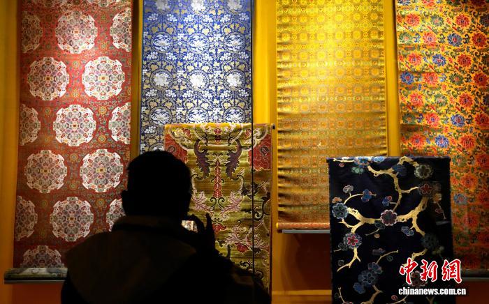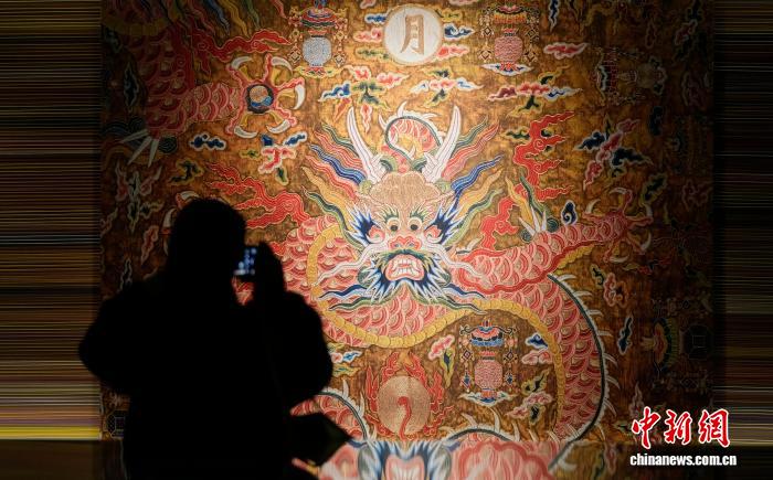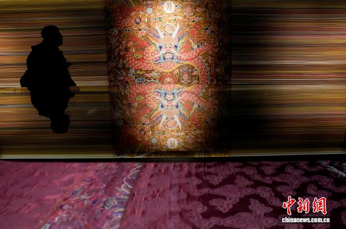 图为观众拍摄展览中的香色地彩云金龙暗八仙纹绒绣织成料。中新社记者 李林 摄