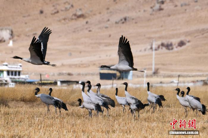 黑颈鹤是中国国家一级保护动物,是唯一生活、繁殖在高原的鹤类,被藏族民众誉为“吉祥鸟”。近日,西藏自治区拉萨市林周县林业和草原局介绍,作为黑颈鹤重要的越冬栖息地,今年该县境内黑颈鹤数量在1800只至2300只之间,其中虎头山水库卡东村一带占比约一半。中新网记者在周边看到,不少黑颈鹤在田间觅食,不时飞翔于高原农田、村落上空,舞动的鹤影和声声鹤鸣为冬春时节的高原增添了几分灵动。图为2月8日,黑颈鹤群在悠闲觅食。江飞波 摄