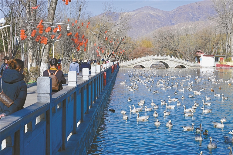 图为市民漫步湖畔,与候鸟近距离接触。记者 索朗旺久 摄