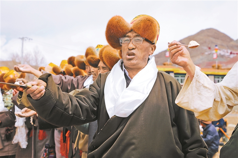 春耕春播仪式上,村民手持糌粑,祈愿五谷丰登、青稞丰收。(图片由林周融媒提供)