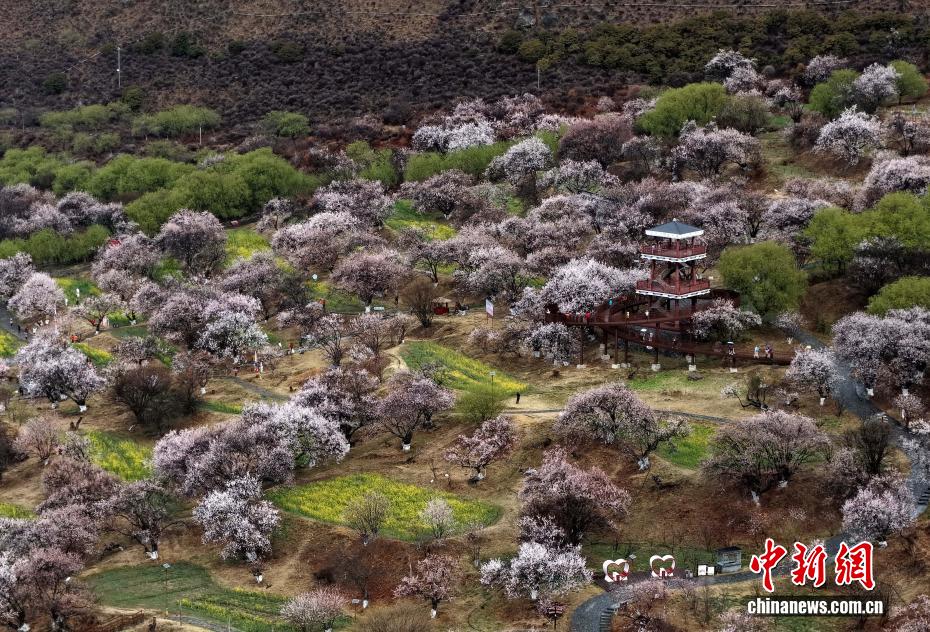 3月27日,西藏林芝市巴宜区嘎拉村桃花美景。时下,西藏林芝市的千余株野生桃树次第绽放,美不胜收。中新社记者 李林 摄(无人机照片)