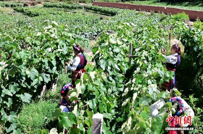2025年夏天,工人们在西藏芒康县一葡萄园里进行夏季管理。(受访者供图)