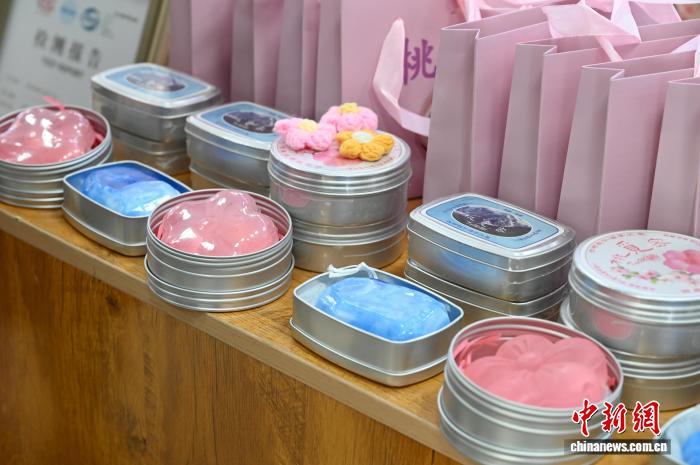 图为桃花世界体验中心内的桃仁油香皂等产品。谢牧摄