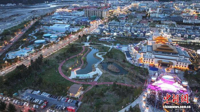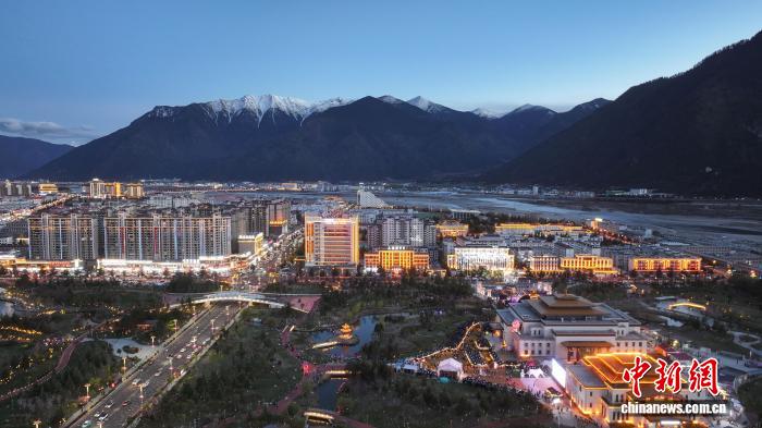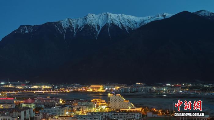 4月3日晚,西藏林芝市城市夜景美,城市建筑、街道的灯光与雪山相映成趣,景色美丽。(无人机照片)中新社记者 贡嘎来松 摄