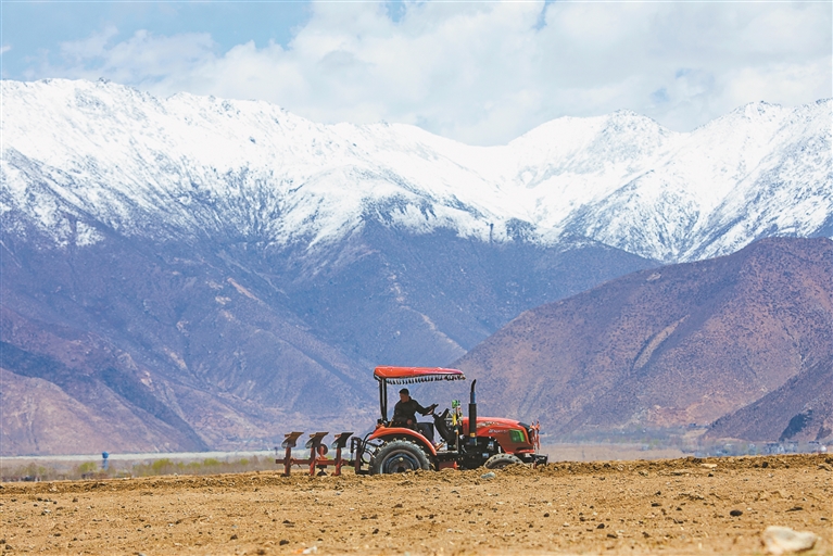 在拉萨市墨竹工卡县唐加乡拉东村,大型农机来回穿梭在田野间翻耕新土。记者 王敏 通讯员 洛克 摄