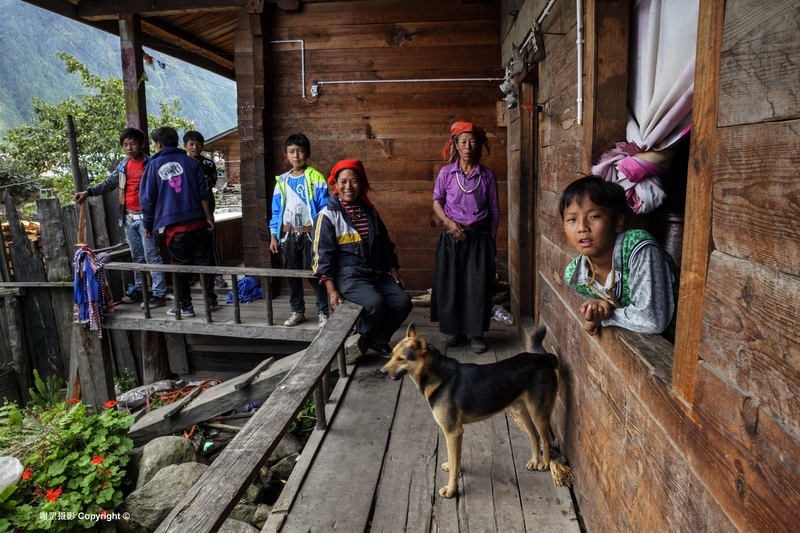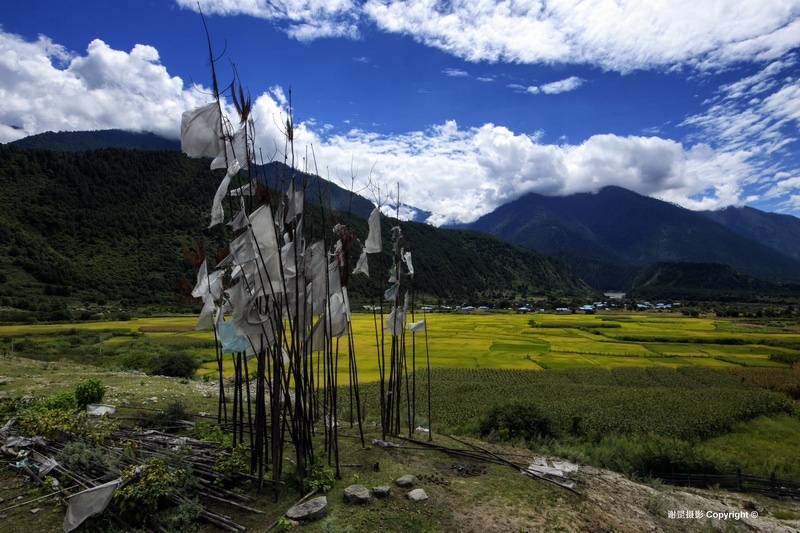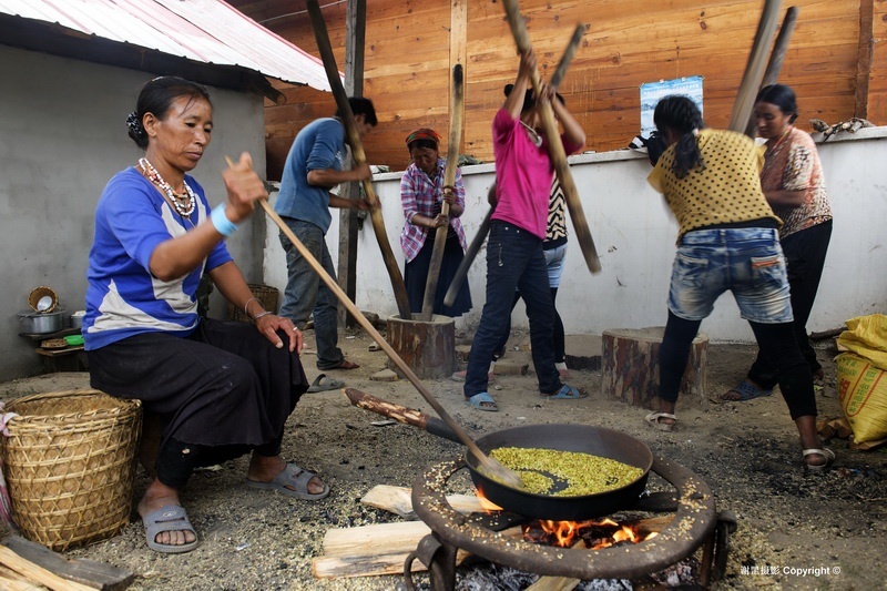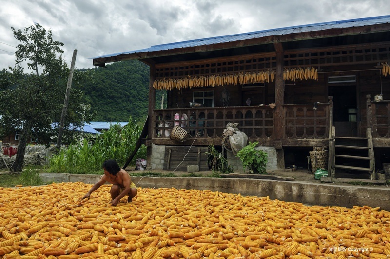 下察隅邻近非法的“麦克马洪线”,边防管理严格,游人被限制在下察隅镇附近活动。这次走近察隅河南端是第一次,没想到这边的风情是这么的美妙,青翠的大山中央是宽阔的察隅河谷,平坦的坝子和台地上层层金黄的稻田,予人富饶美丽的第一印象。据史料记载,这一带最早的居民叫“炯”,在“炯”人首领司那热布颠的带领下,开荒种地,打猎和种水稻。后来“炯”人与藏族发生争战失败而逃到南方山区。“炯”人迁走后,由“杂”和“吉”两个群落的藏族来在这里定居。“杂”是讲土话的藏族,与其他藏族有语言上的很大差异,被称作“杂隅娃”,意即“杂”群落居住地方的人。在这个区域里的沙马、拉丁、松古等村就是至今保持着讲土话的藏族。寻着这个线索,我们到了松古村、沙马村去感受他们的生活。松古和沙马两个村约有200户600余人,都座落在河谷台地上,背靠茂密的青山,远眺察隅河谷,四周被大片的梯田水稻包围着,一片田园农耕景象。由于海拔只有1500米左右,又受孟加拉湾热气流影响大,气候炎热湿润,老年妇人多穿民族传统的短摆裙装,而年轻人多着单薄时尚的常装。语言上保持着自己特有的土话,其他没有更多差别。新农村建设后,吊脚楼与门前长廊风格的新民居宽敞明亮,水电防火等设施齐全,狭窄的老木楼虽还存在,但多为储杂物或养畜之用,新老木楼之间对比强烈。院落前后和村道两侧生长着柿子、梨桃、柑桔和花椒,地里也长满了蔬菜、花生、辣椒,显出一方物产的丰富。这里的人或许传承着先古“杂”人没有阶级划分的传统,勤劳朴实,团结互助,热情好客。中秋打扁谷是团结互助最好的展现,这里出产一种叫扁谷的香米,有降脂保健作用,一般掺入酥油茶中食用。每年中秋节都是采摘舂米的时候,而舂米不是个体行为而是集体劳动,各户将从稻田里采摘来的扁谷统一拿到舂米房,一边烤香一边舂制。全村人像过节一样全部汇聚在一起轮番上阵,只有欢笑没有偷懒也没有你多我少。最后各家拿着舂制好了的扁谷高高兴兴回家。这里的人们早已结束贫困的日子,盛产谷物,优良的多类种植条件,本己富足有余,每年还享受政府几万元的各种农村补贴,日子过得舒舒服服。这里的人们没有信仰佛教的传统,除了农忙的时候,基本上就是在喝米酒,看电视,唱歌跳舞中度过。松古村村长四娜美朵朴实的语言说,我们的信仰就是毛主席和共产党。