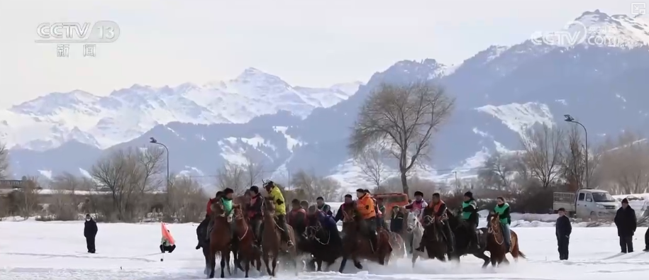 一大早,8支赛马队的近百名骑手就在新疆吉木萨尔县新地乡的赛马场展开叼羊大赛。骑手们策马冲向场中的羊只,雪地上顿时马蹄纷飞、雪花四溅。