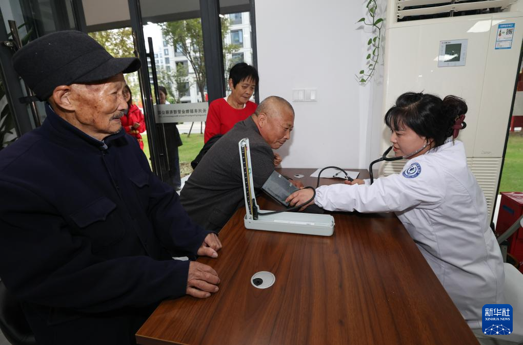 10月21日,医务人员在给老人测血压。新华社记者 徐昱 摄