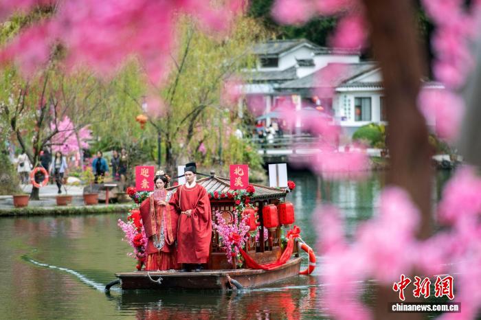 2月27日,第十五届永春桃花季古风姻缘会系列活动在福建永春县启动。图为游船上的新人。康庆平 摄