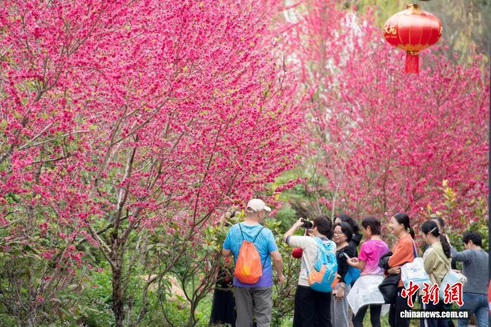 “福建最美乡村”永春县北溪村桃花迎春绽放。图为2月27日,游客在永春县北溪文苑游玩赏花。康庆平 摄