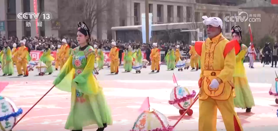 在锣鼓队的演奏中,青海海东市的民俗巡游活动拉开帷幕。由27支表演队伍、3000多名表演者组成的方阵浩浩荡荡走上街头,高跷表演一出场,瞬间点燃了现场气氛。“百龙千狮”队伍威武雄壮,舞龙飞腾跳跃;雄狮摇头摆尾,引得观众阵阵喝彩。紧随其后,百人扇子队、百人花束队、土族安昭舞等民俗节目也逐一亮相,表演中,演员还会与沿途观众热情互动,让现场的外国游客感受到了中国独特的文化魅力。