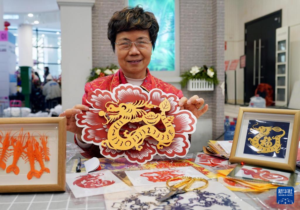 1月28日,艺术家在年俗主题市集上展示龙年主题剪纸。新华社记者 刘颖 摄