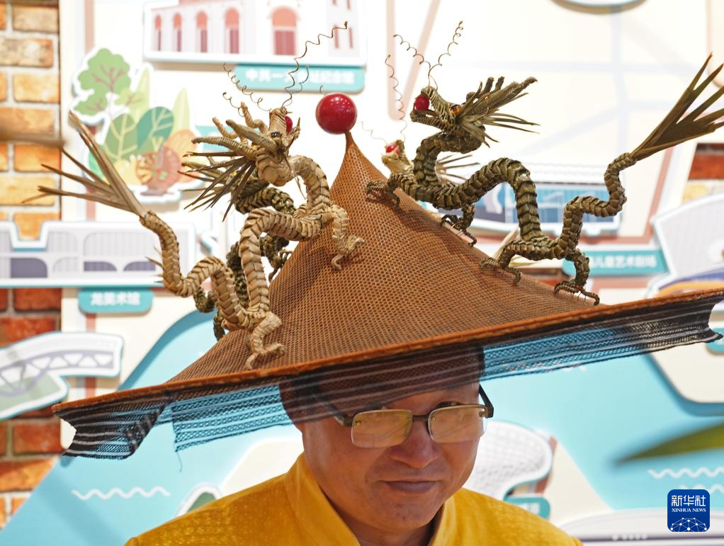 1月28日,在年俗主题市集上,一名棕编非遗技艺传承人展示迎龙年主题的造型帽子。新华社记者 刘颖 摄