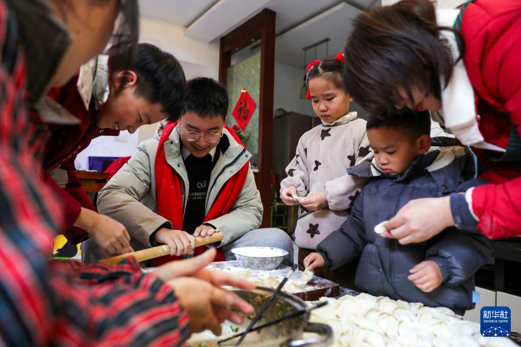 2月16日,在江苏省扬州市邗江区荷叶小区一户人家,大人带着孩子包饺子。新华社发(齐立广摄)