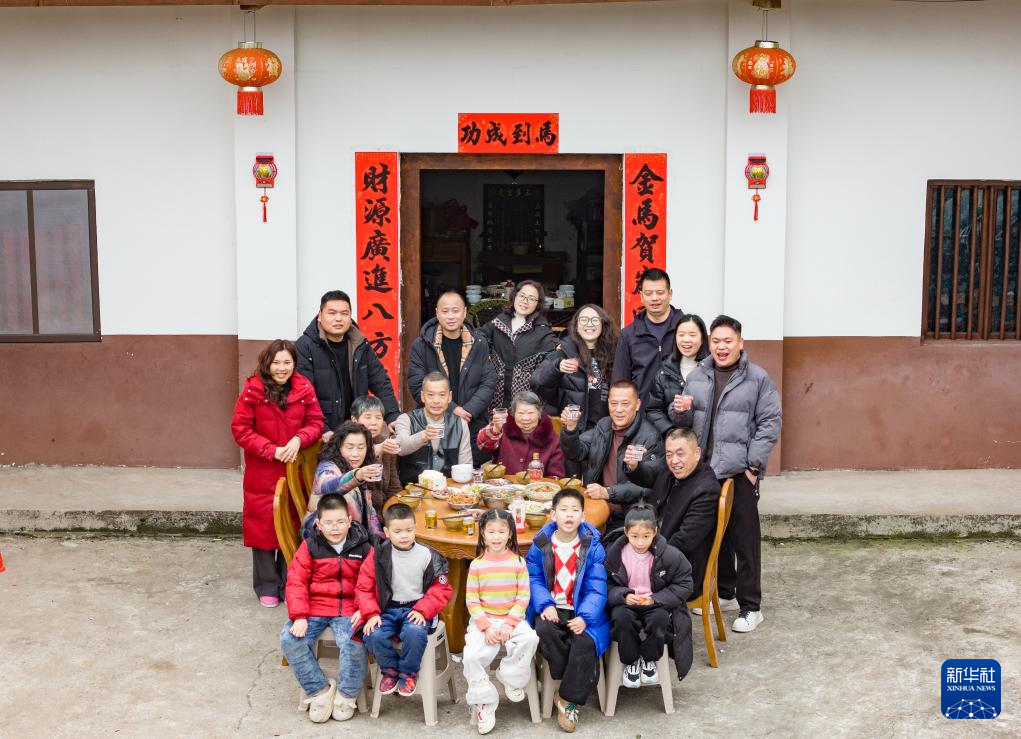 2月16日,在四川省南充市顺庆区清平村,村民陈俊尧一家祖孙四代吃团年饭。新华社发(彭珉翔摄)