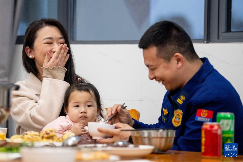 2月16日,在江苏省泰兴市澄江西路消防救援站,消防员和家属一起吃团圆饭。新华社发(杨玉岗摄)