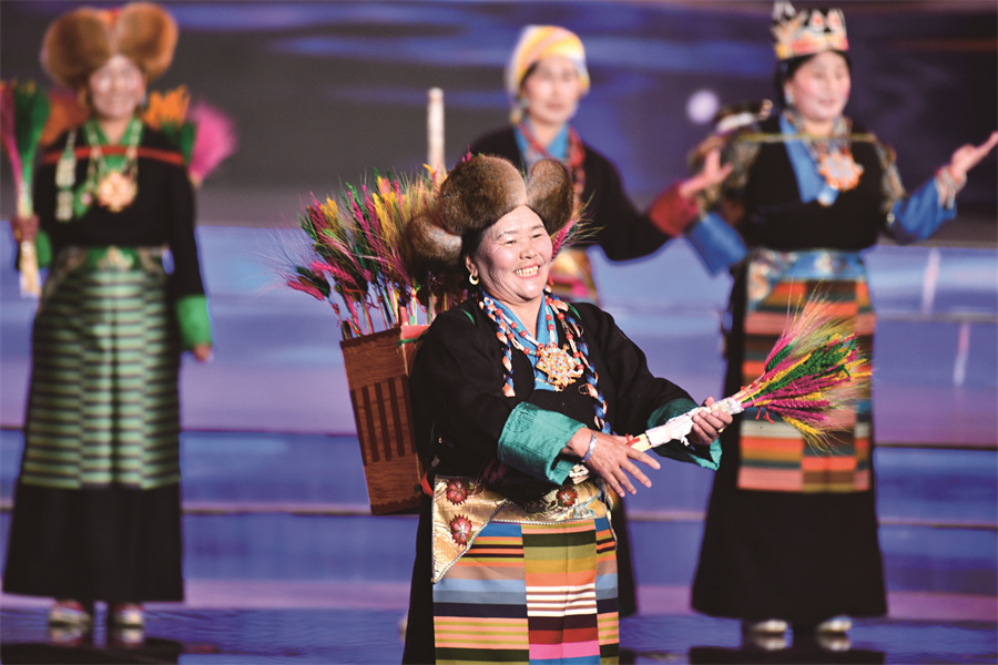 在拉萨市2026年春节藏历火马新年联欢会现场,阿佳央金和农牧民妇女一起带来了“村T”走秀。赵振宇 摄
