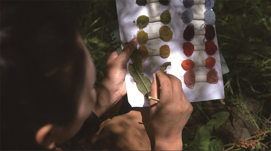 次仁曲珍用野外采集的花草扩充天然染色板。