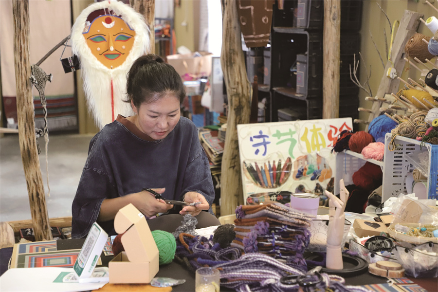 和老人一起工作的其他妇女则一边忙活一边轻声哼唱,欢快的歌声和织机“哒哒”的节奏声中,一撮撮彩色的羊毛经过手工捻线、精心编织等环节,变成了围巾、藏毯、户外产品等具有浓厚民族特色的手工艺品。