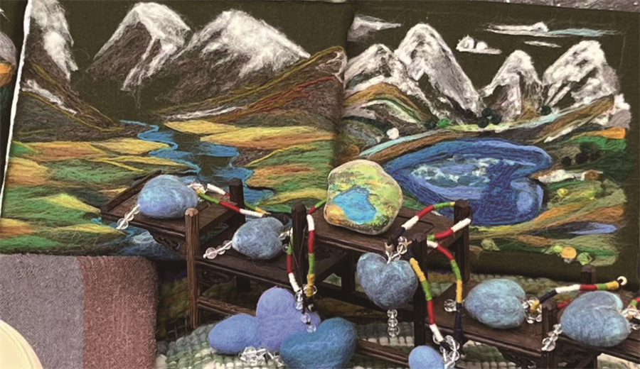 店铺里的小动物文创,个个憨态可掬,毛绒绒、圆滚滚很讨人喜欢;五彩织绳系着一颗用羊毛缠绕的湛蓝色的心,伸手轻轻按压时,还会像心跳般微微起伏……各式各样的文创包包同样令人目不暇接。