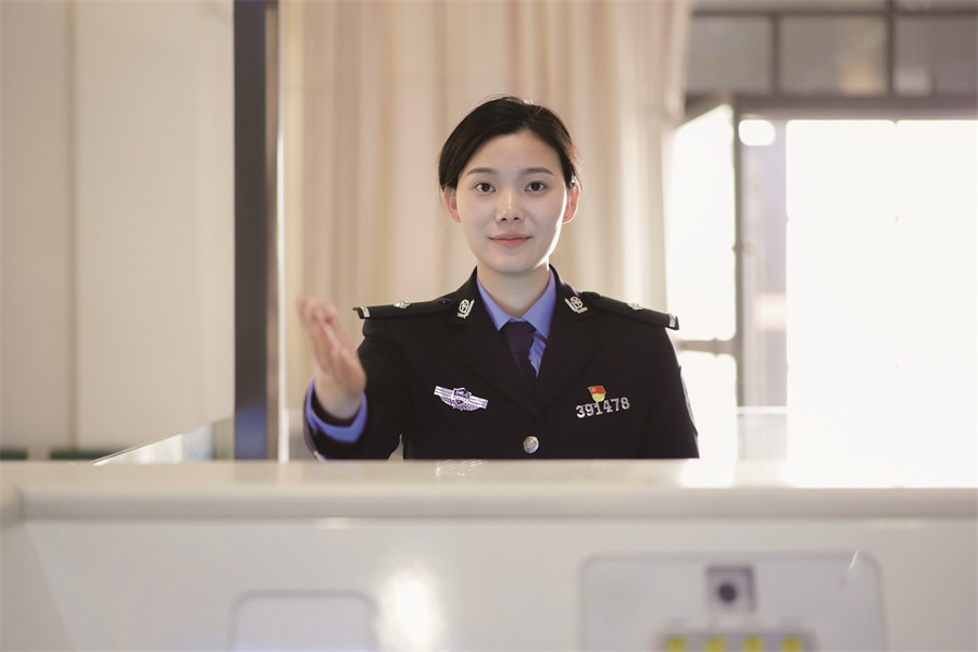 从小听着父亲在边境巡逻的故事长大,“橄榄绿”是白玛央宗童年最深刻的记忆。父亲常教导她:“守土有责,守土尽责。”2019年,随着公安边防部队改革,父辈的“橄榄绿”变成了她的“藏青蓝”。身份在变,但那份流淌在血液里的忠诚从未改变。白玛央宗将藏族儿女特有的淳朴与热情融入边检工作,面对首次乘机的藏族同胞,她用家乡话耐心引导,化解他们的不安;面对外籍旅客,她进行专业细致的解答,展示大国形象。她常说:“父亲当年用双脚丈量界碑,现在我用微笑守卫国门。”在三尺验证台上,白玛央宗用流利的外语和专业的素养,迎接八方来客。