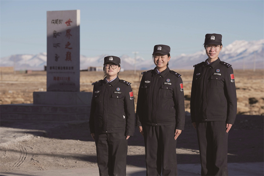 普玛江塘三位女警在“世界之巅”石碑前合影,左起:李天娇、李红炎、武慧。
