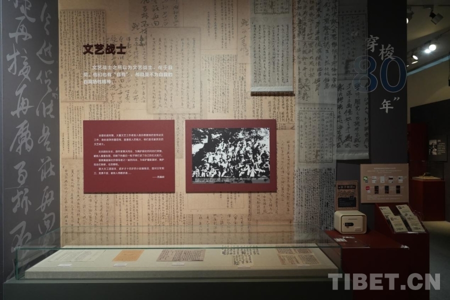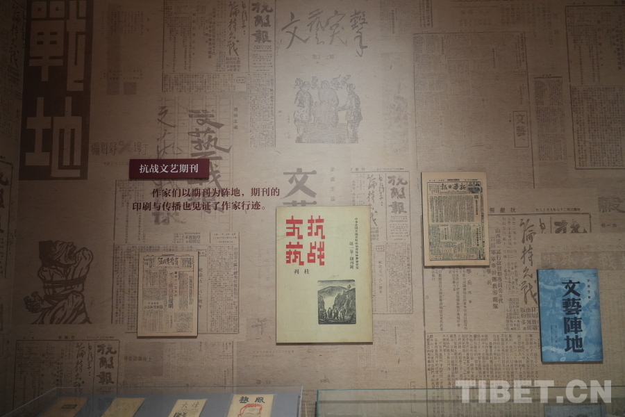 图为中国现代文学馆内,“山河迹忆——手稿里的抗战中国”展览中“文艺战士”展示墙 摄影:郭睿佳