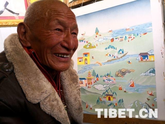 图为嘎玛乡老艺人嘎玛德勒向记者介绍正在制作中的唐卡 摄影:王淑