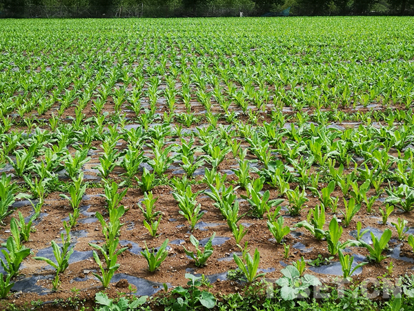 记者在现场看到,流转的土地大部分都已经覆盖上了黑色的遮阳网,在路边连成一片,明媚的阳光洒在上面不时反射着些许亮光,格外引人注目。部分早些下种的莴笋已经破土而出,长势喜人。