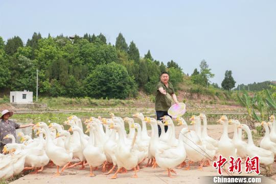图为蒋乙嘉正在喂养肉鹅。 蒋东宏 摄