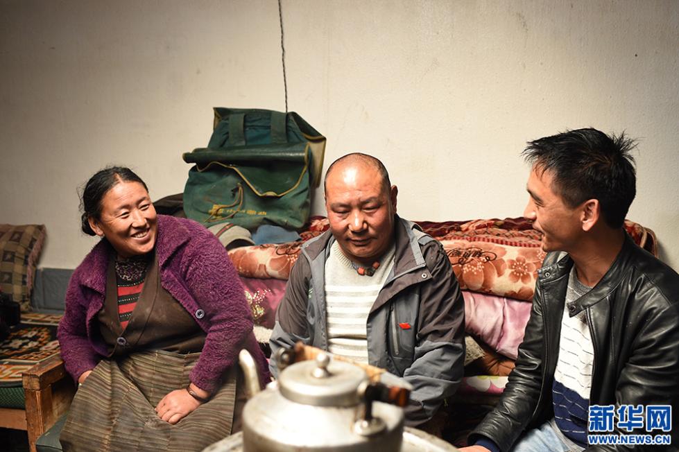 居住在西藏山南市隆子县玉麦乡的邮递员白玛江才(右)聊起了即将搬进政府为他家盖的新房开怀大笑(5月9日摄)。新华网 马艺萌 摄