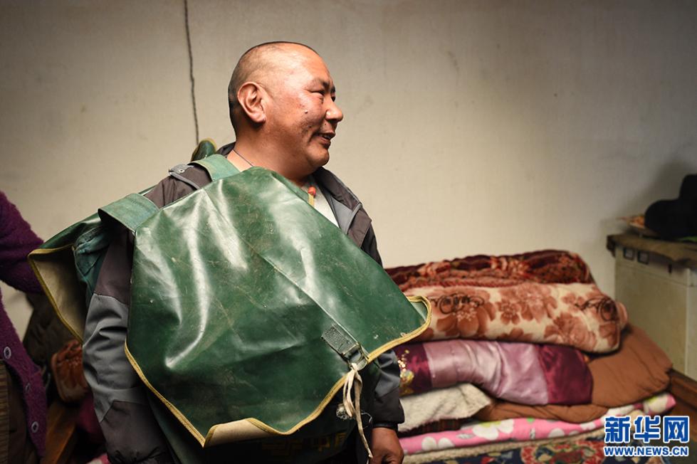 邮递员白玛江才背起了自己的送邮袋(5月9日摄)。新华网 马艺萌 摄