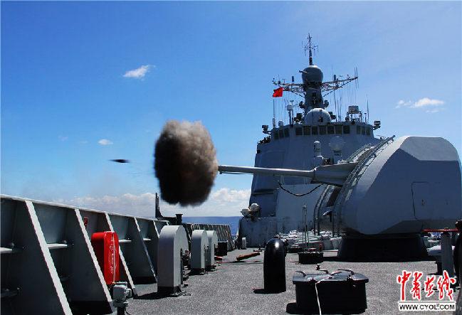 2014年6月19日,海口舰参加多国联演任务,图为海口舰主炮射击。于林 摄