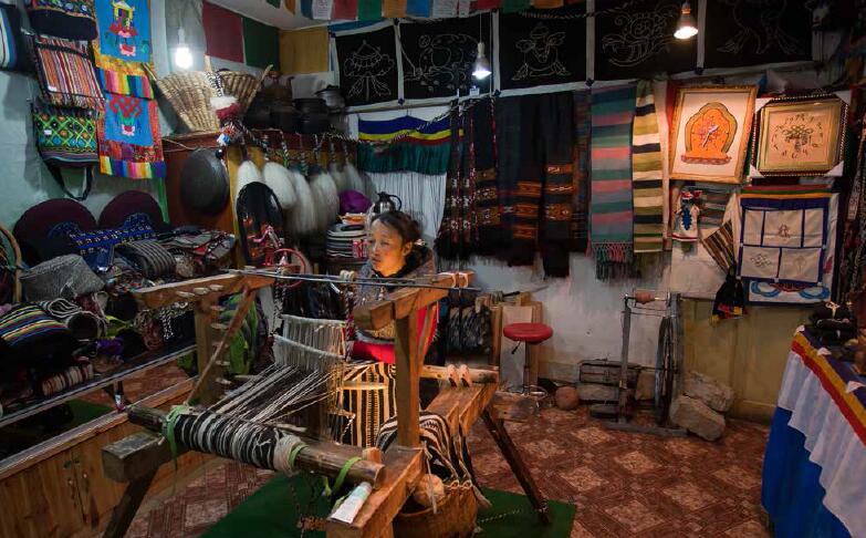 店内的款式多样、设计新颖、做工精细的背包、挎包、围巾、毛毯等,简直是拉萨民间手工编织工艺品的大集合,珠杰的小女儿正在编织氆氇。