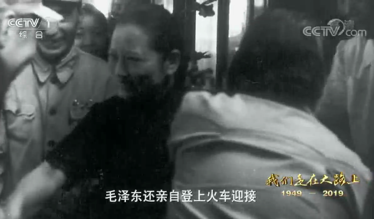 从《我们走在大路上》第一集公布的历史资料看,毛泽东亲自登上火车迎接了宋庆龄。宋庆龄与毛泽东热情地握手,她梳着整齐的发髻,身着旗袍,仪态端庄大方,亲切地接过簇拥的人群献上的花束。