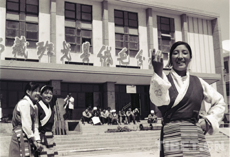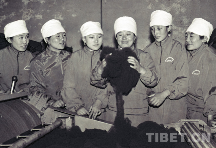 图为过去手拿牧鞭的牧女格桑措姆(左四)和伙伴次仁央金(左三)、央金卓嘎(左一)、梅朵娜珍(右一)等在一起分享劳动成果的优质无毛绒。她们是该厂的生产能手,并被评为厂先进工作者(唐召明1994年5月2日摄)