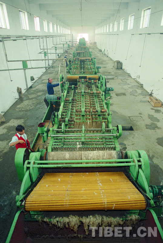 这是那曲羊绒分梳厂工人正在准备分梳羊绒。该项目由对外经济贸易部援建(唐召明1997年摄)