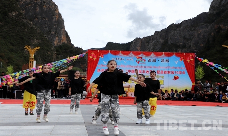 图为昌都市岗托镇小学生在丰收节表演舞蹈