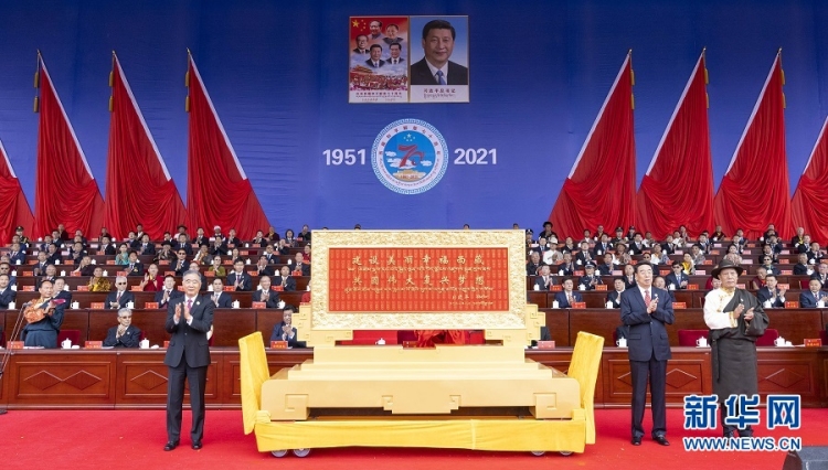 2021年8月19日,西藏自治区和平解放70周年。中共中央政治局常委、全国政协主席、中央代表团团长汪洋向西藏自治区赠送了中共中央总书记、国家主席、中央军委主席习近平题词的“建设美丽幸福西藏 共圆伟大复兴梦想”贺匾等纪念品。