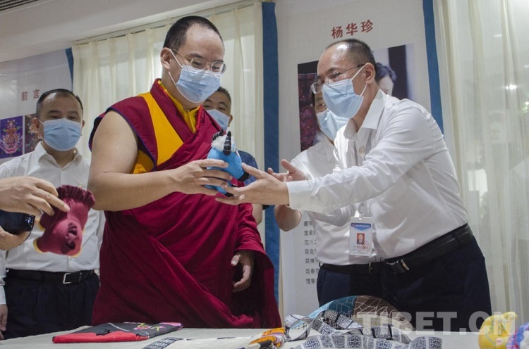 图为吉福社区工作人员向班禅展示手工艺品 摄影:欧帆