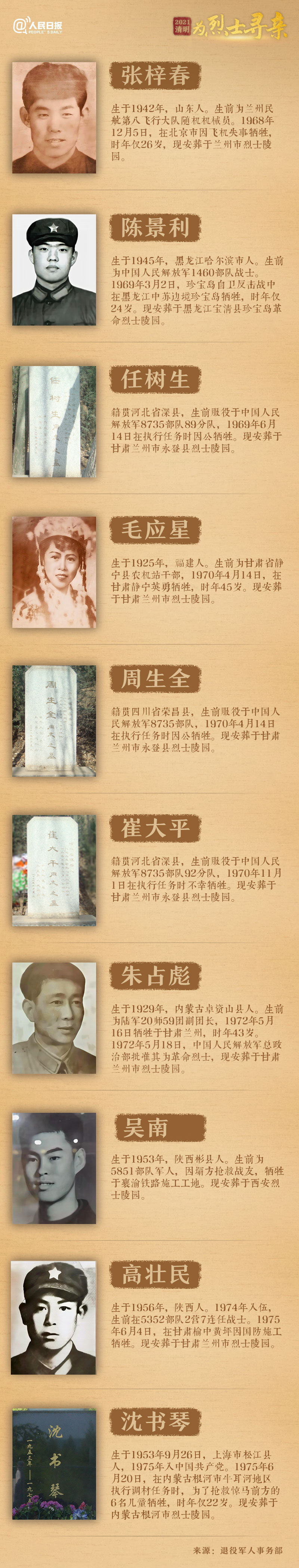 同时,退役军人事务部联合人民日报客户端等媒体,公布100位烈士的寻亲线索。这100位烈士的牺牲时间跨越1928年到1984年。烈士们生前有的是军人,有的是地下党员,有的是工人,有的是教师学生。不少烈士的出生年份等关键信息缺失,一些烈士未留下照片。